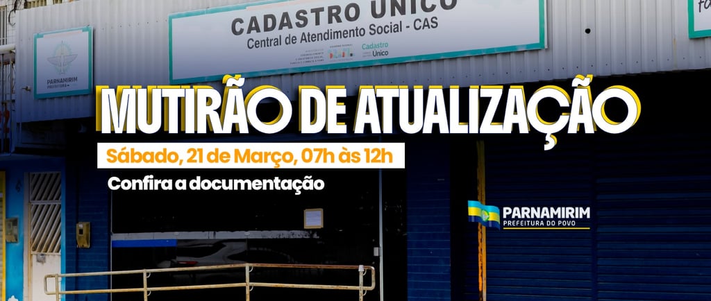 Com milhares de famílias inseridas na base de dados do Cadastro Único em Parnamirim, a Prefeitura, por meio da Secretaria Municipal de Assistência Social (Semas), informa que neste sábado (21), das 7h às 12h, a Central de Atendimento Social (CAS) realizará mais um mutirão de atualização para famílias que estão com o cadastro desatualizado há mais de 24 meses.