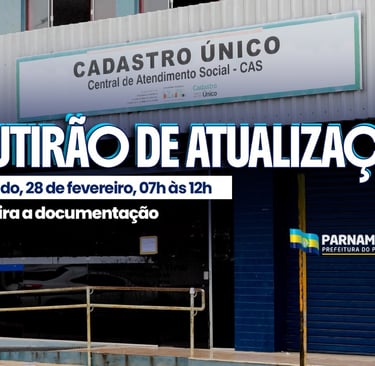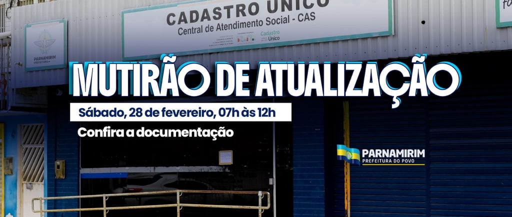 A Prefeitura de Parnamirim, por meio da Secretaria Municipal de Assistência Social (Semas), informa que nesta sexta-feira (28), das 7h às 12h, a Central de Atendimento Social (CAS) realizará o mutirão do Cadastro Único. A ação é destinada às famílias que estão com o cadastro desatualizado há mais de 24 meses ou que desejam realizar um novo cadastro.