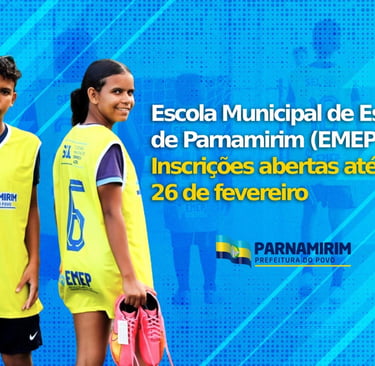 A Prefeitura de Parnamirim, por meio da Secretaria de Esporte e Lazer (SEL), está com inscrições abertas para a Escola Municipal de Esportes de Parnamirim (EMEP). Os interessados podem se inscrever gratuitamente até o dia 26 de fevereiro nas modalidades futsal, vôlei de quadra e futebol de campo.