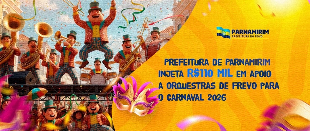 A Prefeitura de Parnamirim abre suas portas para o ritmo contagiante do frevo no Carnaval 2026. A Secretaria de Turismo e Desenvolvimento Econômico (Setude) vai destinar até R$110 mil para apoiar 25 orquestras que vão enriquecer a programação cultural do evento, que ocorre de 6 a 18 de fevereiro em Pirangi. As inscrições são gratuitas e já estão abertas, podendo ser feitas até o dia 18 de janeiro no site da Prefeitura (https://edital.setude.parnamirim.rn.gov.br/#/portal/inicio) – uma ótima chance para grupos musicais brilharem no maior carnaval do litoral potiguar.