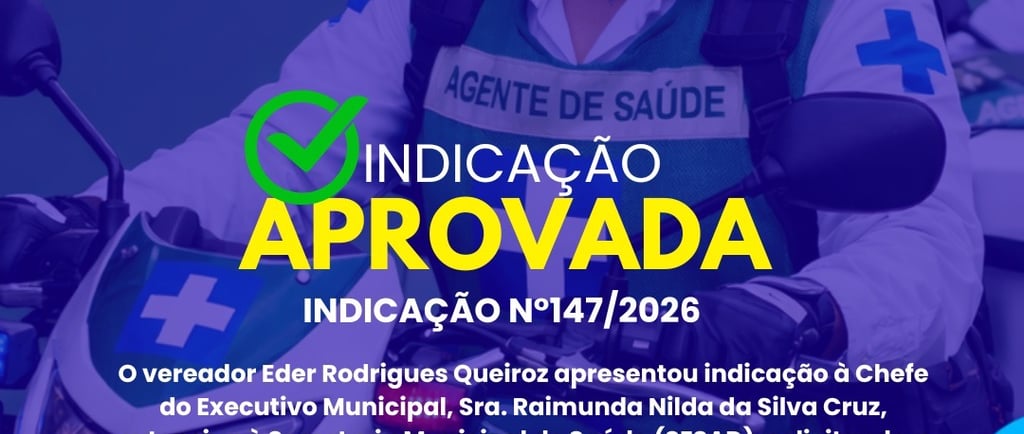 A indicação também destaca a importância da valorização dos agentes de saúde, considerados fundamentais na execução das políticas públicas do setor, e aponta a medida como um reforço às estratégias de fortalecimento da rede municipal de saúde, aproximando os serviços da população e ampliando a capacidade de resposta do sistema público.
