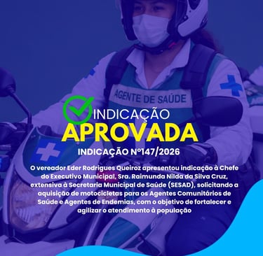 O vereador apresentou a Indicação nº 147/2026 solicitando à prefeita Raimunda Nilda da Silva Cruz, com extensão à Secretaria Municipal de Saúde, a aquisição de motocicletas para os Agentes Comunitários de Saúde e os Agentes de Combate às Endemias do município de Parnamirim.